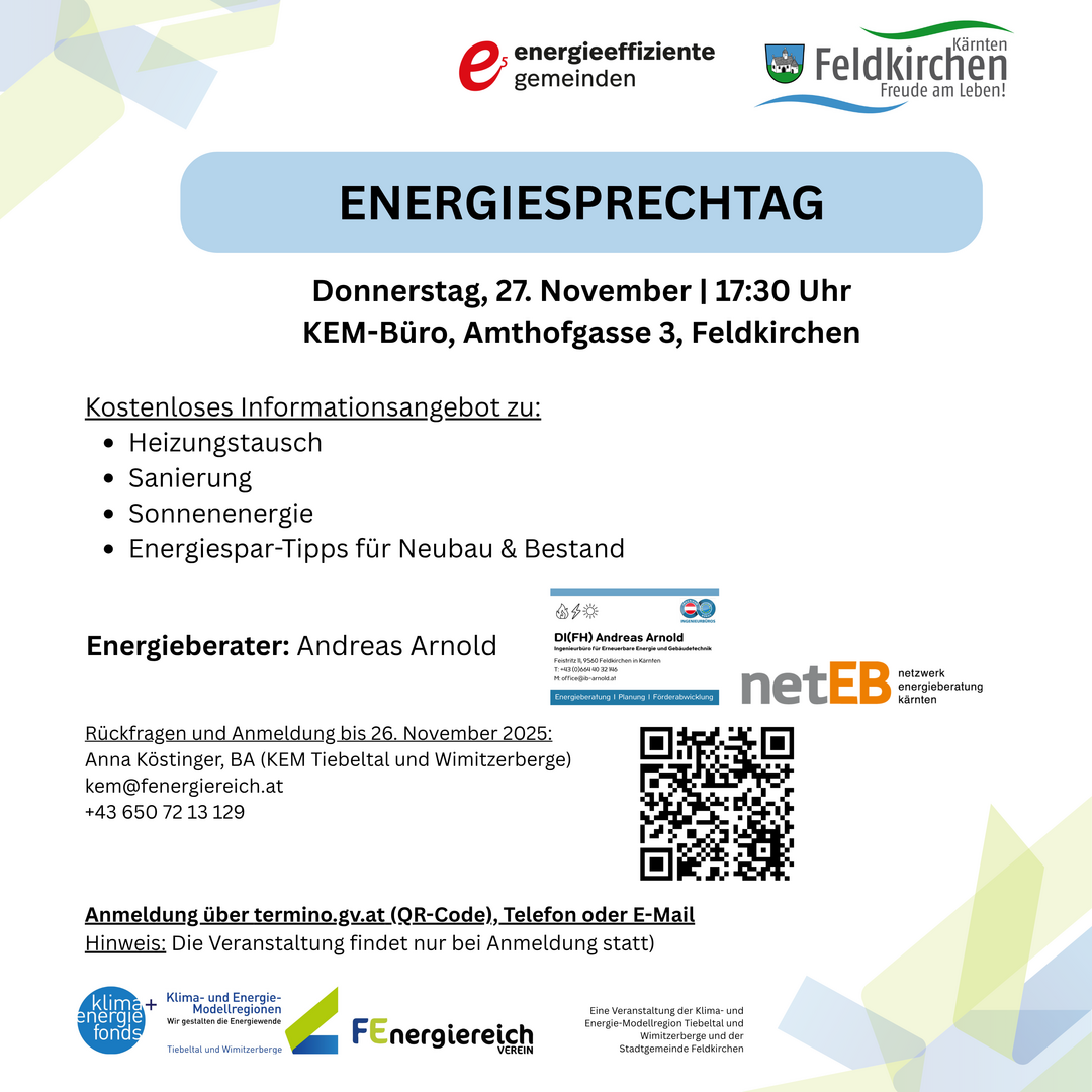 Antworten auf diese Fragen liefert der Energiesprechtag der Klima- und Energie-Modellregion (KEM) Tiebeltal und Wimitzerberge gemeinsam mit der Stadtgemeinde Feldkirchen/Kärnten am Donnerstag, 27. November 2025 von 17:30 bis 19:30 Uhr.